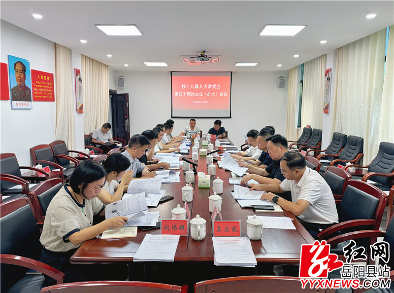 嶽陽縣融媒體中心8月21日訊(周昱君)8月21日,縣人大常委會黨組書記、主任周峰主持召開縣十八屆人大常委會第44次主任(擴大)會及縣第十八屆人大常委會第27次會議,黨組副書記、副主任王衛兵,副主任彭碧芳、胡秉陽、吳承棉、任三星出席。縣人民檢察院檢察長閔孚君列席常委會會議。