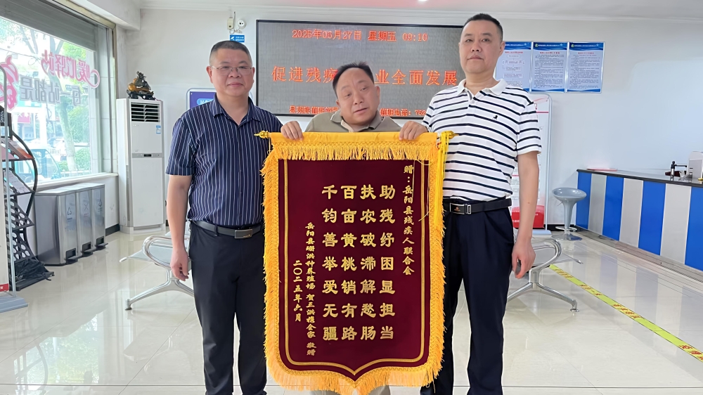 “助殘抒困顯擔當,扶農破滯解愁腸。百畝黃桃銷有路,千鈞善舉愛無疆。”——一麵鮮紅的錦旗被殘障果農賀三洪緊緊攥在手中,錦旗上的燙金大字映著他濕潤的眼眶,隨錦旗一同送來的,還有一封情真意切的感謝信。在嶽陽縣殘聯辦證大廳裏,賀三洪正與殘聯黨組書記、理事長劉其波分享著黃桃銷售破滯的喜悅,工作人員遞上的熱茶氤氳著熱氣,正如這一場愛心接力傳遞的溫度。