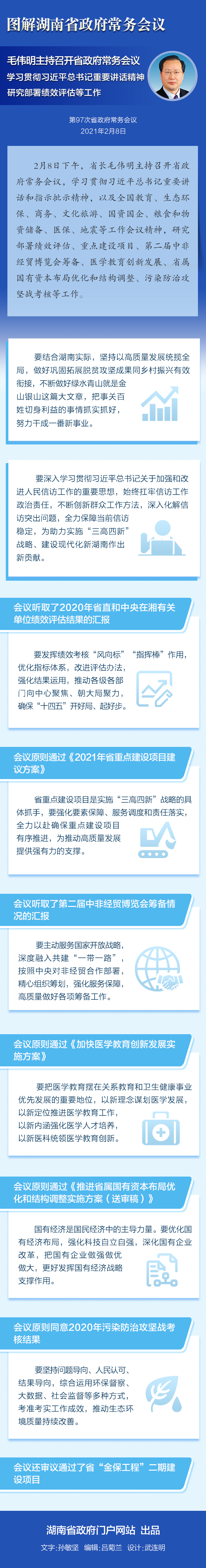 2月8日下午,省長毛偉明主持召開省政府常務會議,學習貫徹習近平總書記重要講話和指示批示精神,以及全國教育、生態環保、商務、文化旅遊、國資國企、糧食和物資儲備、醫保、地震等工作會議精神,研究部署績效評估、重點建設項目、第二屆中非經貿博覽會籌備、醫學教育創新發展、省屬國有資本布局優化和結構調整、汙染防治攻堅戰考核等工作。