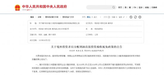 《公告》明確,在2025年1月1日至2028年12月31日期間,境外投資者以中國境內居民企業分配的利潤用於境內直接投資,符合條件的可享受稅收抵免。