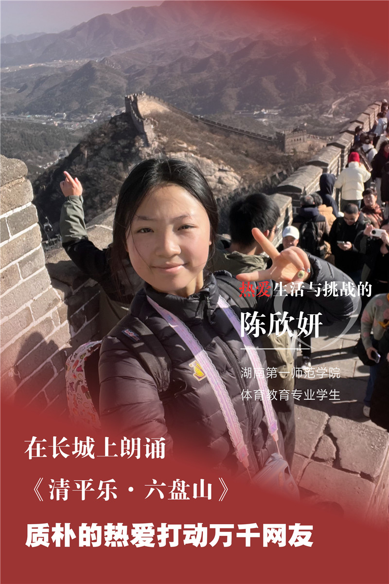 來自天南海北的年輕人,接力在長城上誦詩抒懷。帶起這波熱潮的,是來自湖南第一師範學院的陳欣妍。
