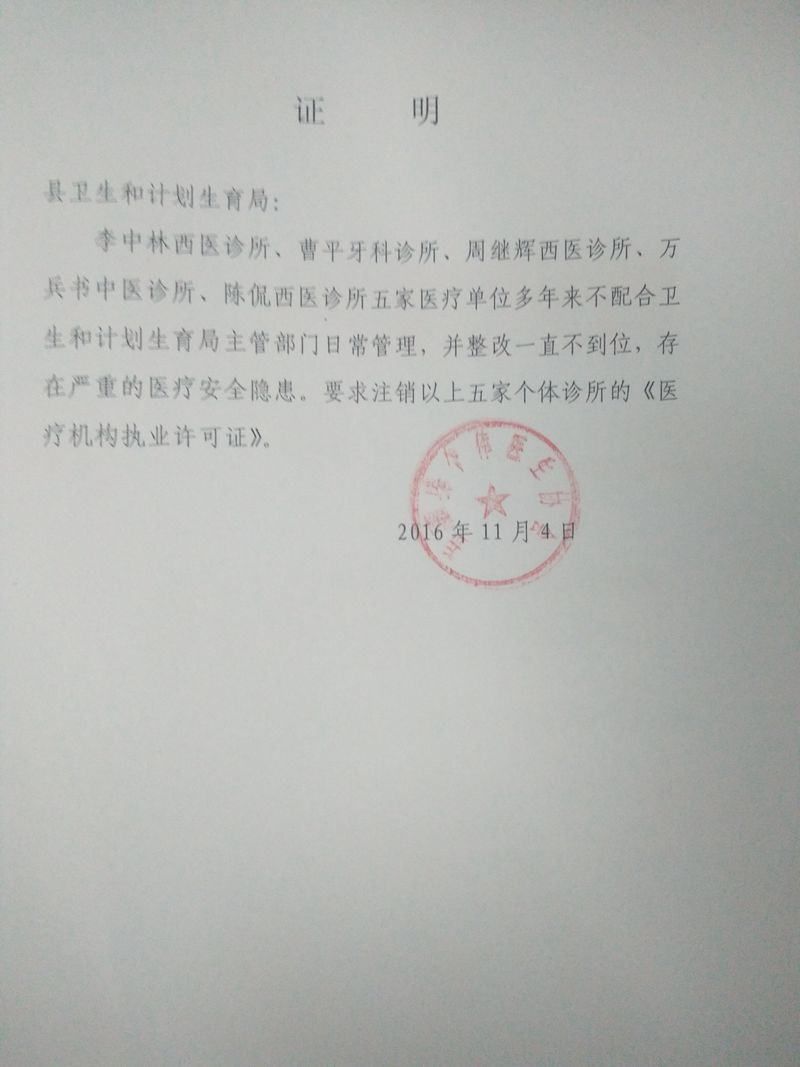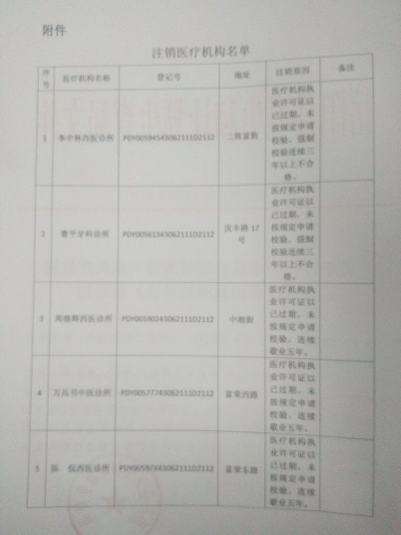 關於注銷李中林西醫診所等五家醫療機構 《醫療機構執業許可證》的通知