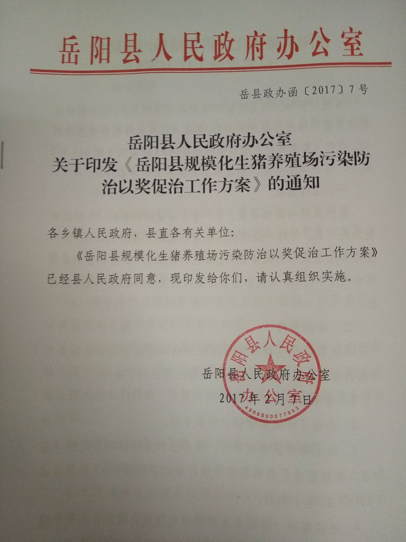 嶽陽縣生豬養殖汙染防治以獎促治資金