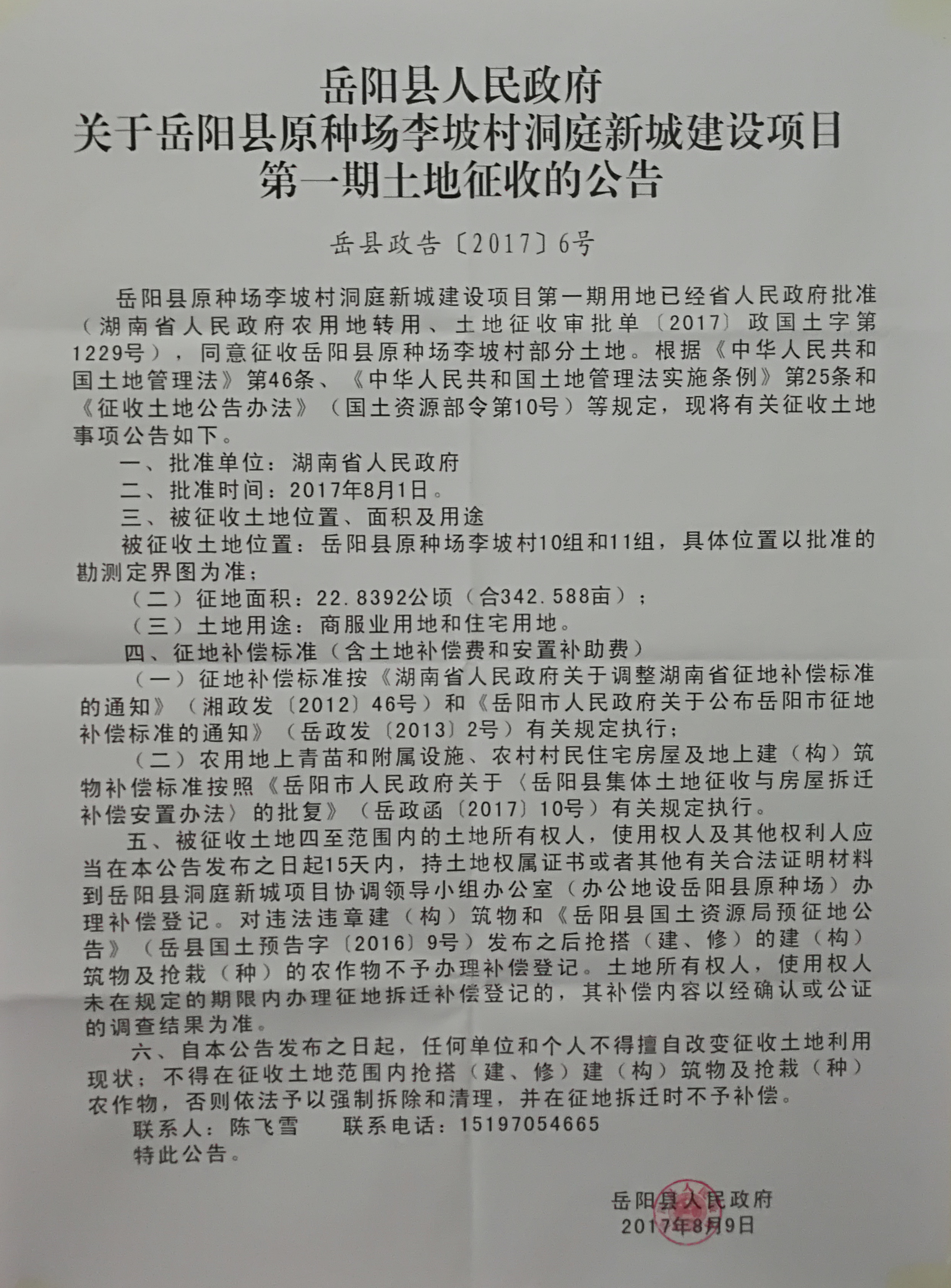 關於嶽陽縣原種場李坡村洞庭新城建設項目第一期土地征收的公告