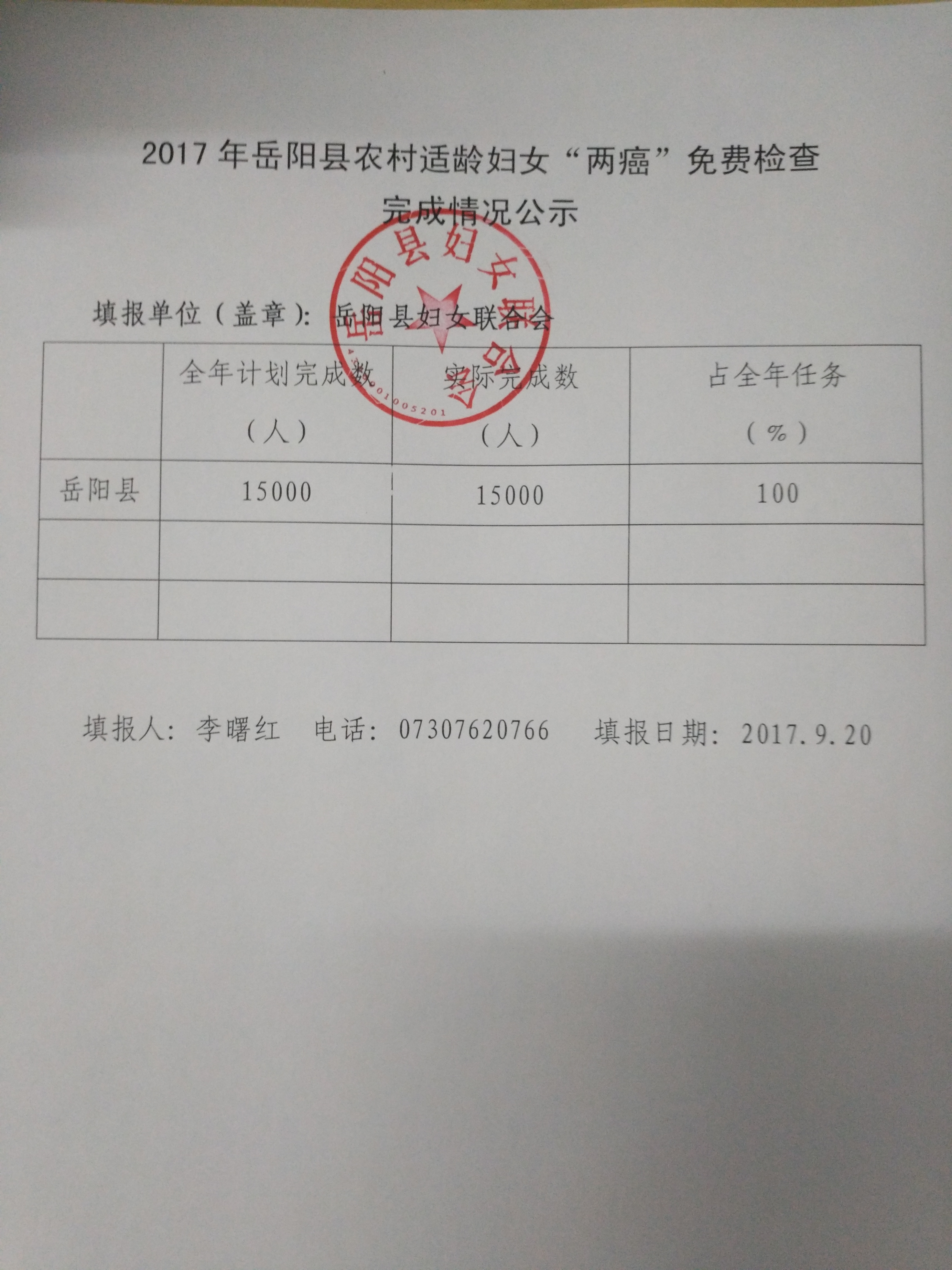 2017年嶽陽縣農村適齡婦女“兩癌”免費檢查完成情況公示