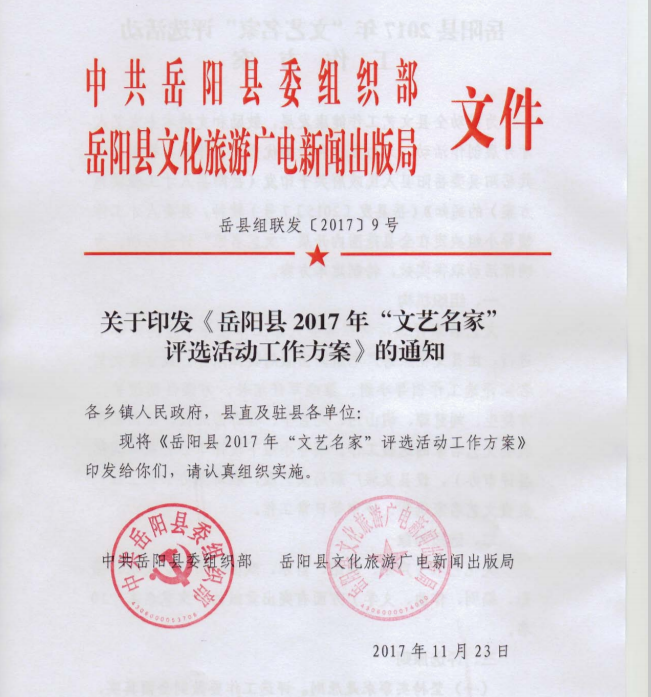 為推動全縣文藝工作健康發展,鼓勵和支持本土文藝人才開展創作活動,大力弘揚和傳播優秀文藝作品,根據《中共嶽陽縣委嶽陽縣人民政府關於印發〈嶽陽縣人才工程實施方案〉的通知》(嶽縣發〔2015〕7號)精神,縣委人才工作領導小組決定在全縣範圍內開展“文藝名家”評選活動。為確保活動取得實效,特製定本方案。