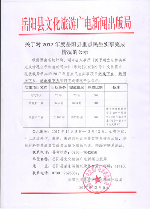 關於對2017年度嶽陽縣重點民生實事(文化惠民工程)完成情況的公示
