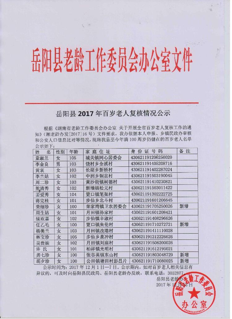 嶽陽縣2017年百歲老人複核情況公示