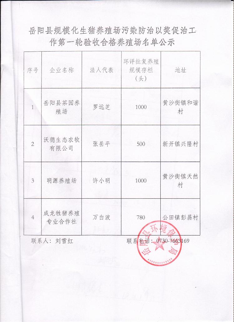 嶽陽縣規模化生豬養殖場汙染防治以獎促治工作第一輪驗收合格養殖場名單公示