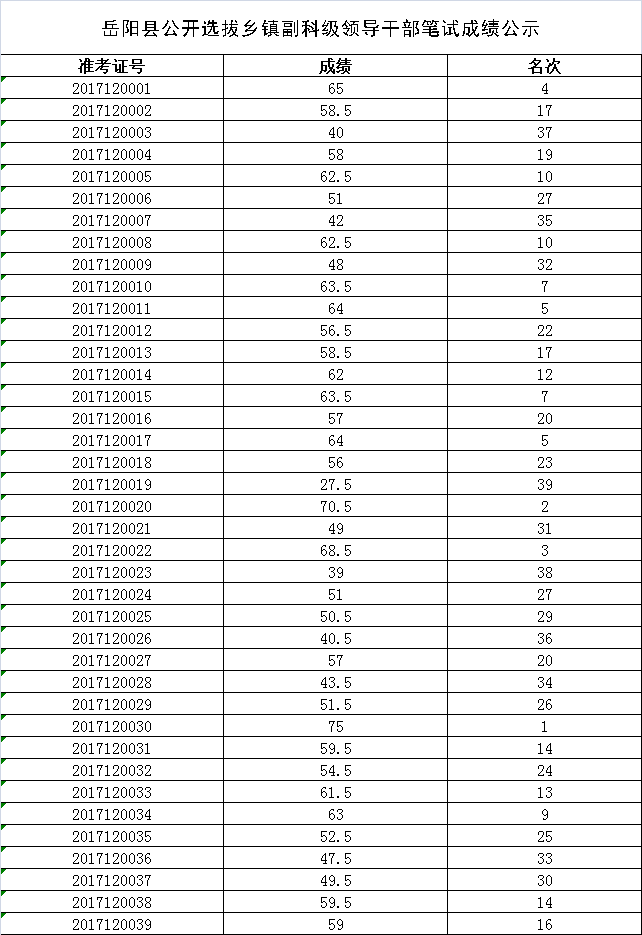 嶽陽縣公開選拔鄉鎮副科級領導幹部筆試考試已於2017年12月21日上午結束,現將筆試成績進行公示,考生如有異議或有情況需要反映的,請以真實姓名向縣委組織部幹部監督問責辦公室電話、書麵反映(電話7621430),或到縣委組織部與有關負責人麵談。