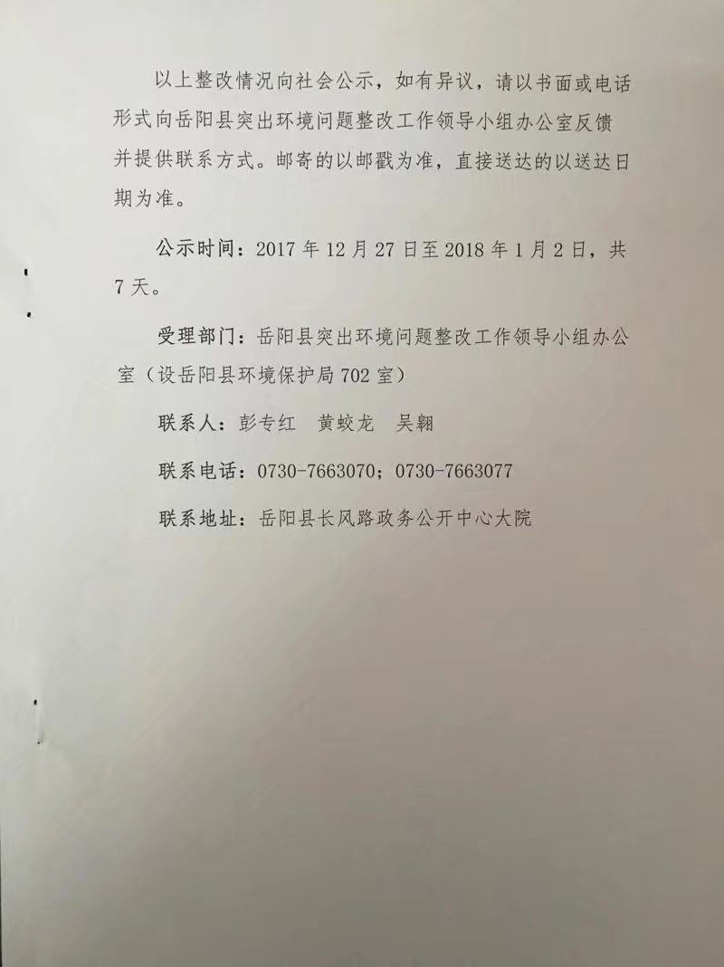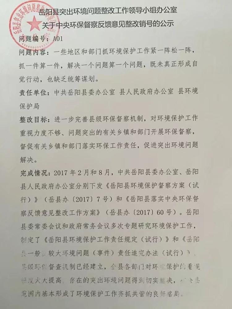 嶽陽縣突出環境問題整改工作領導小組辦公室關於中央環保督察反饋意見整改銷號的公示A01