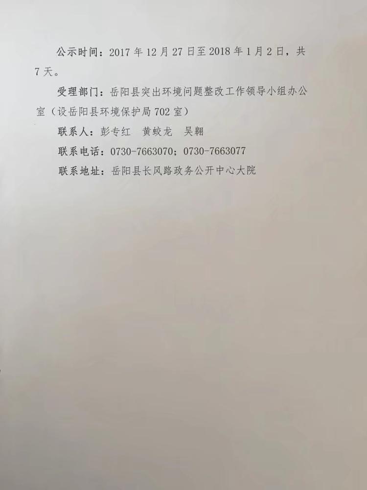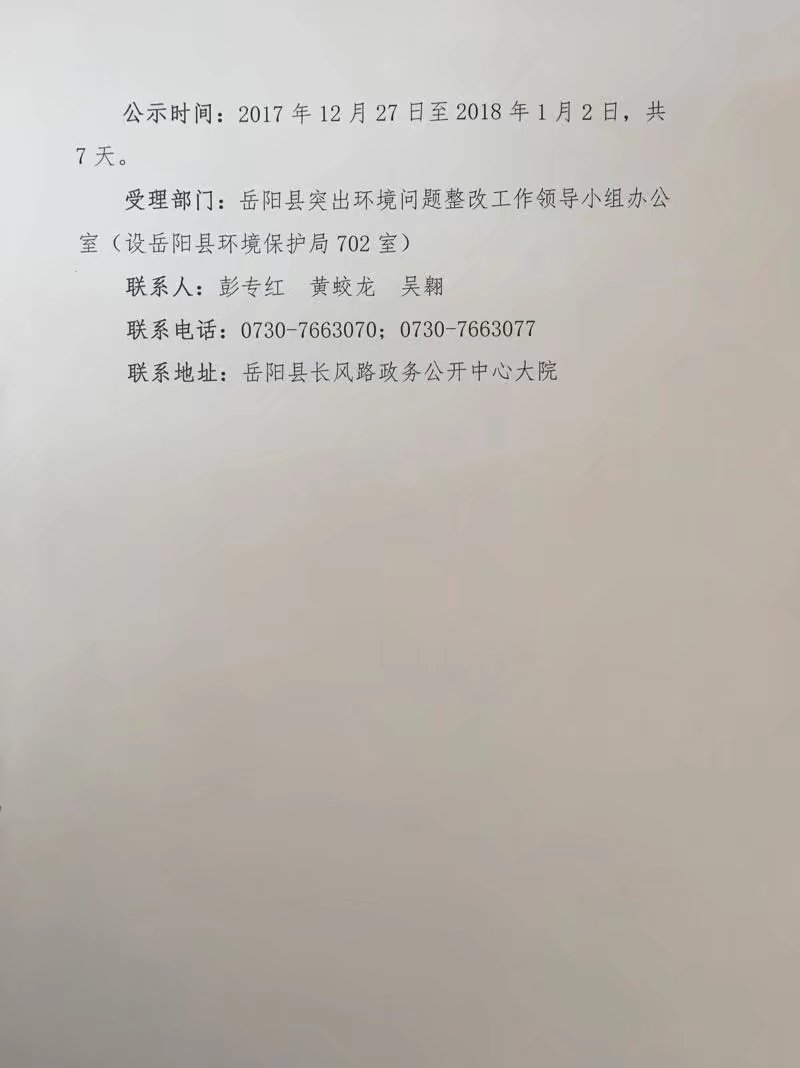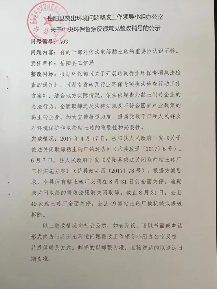 嶽陽縣突出環境問題整改工作領導小組辦公室關於中央環保督察反饋意見整改銷號的公示A03