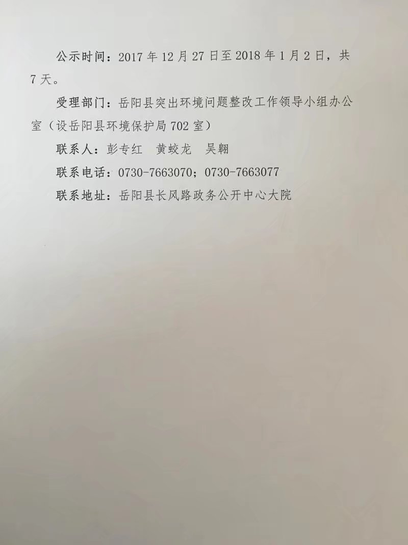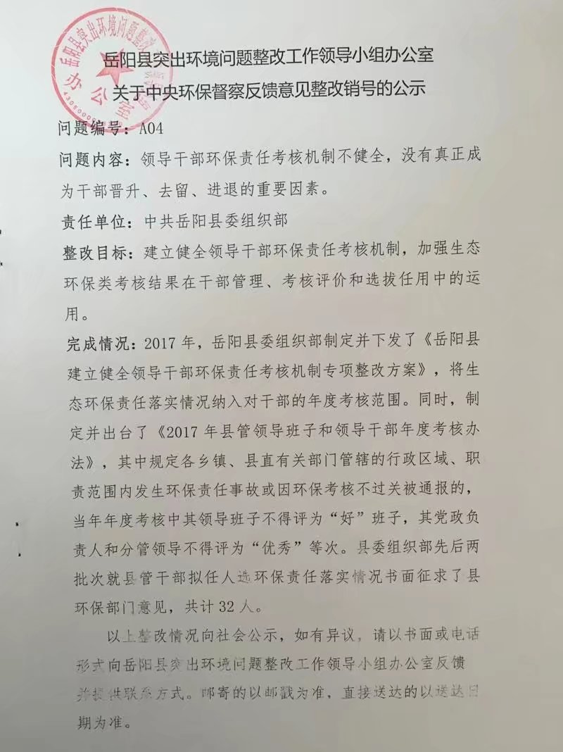 嶽陽縣突出環境問題整改工作領導小組辦公室關於中央環保督察反饋意見整改銷號的公示A04