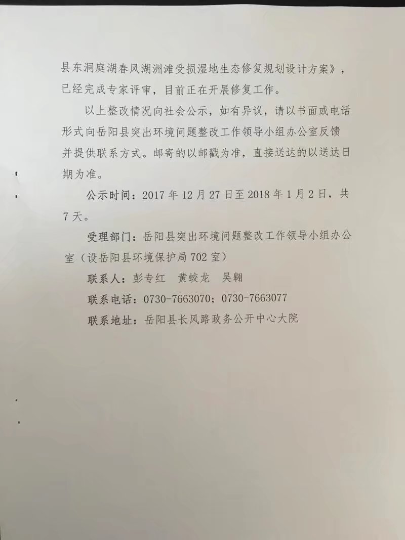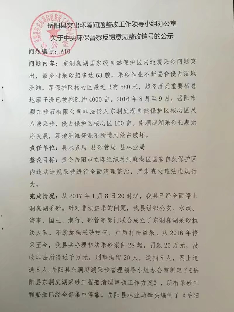 嶽陽縣突出環境問題整改工作領導小組辦公室關於中央環保督察反饋意見整改銷號的公示A10