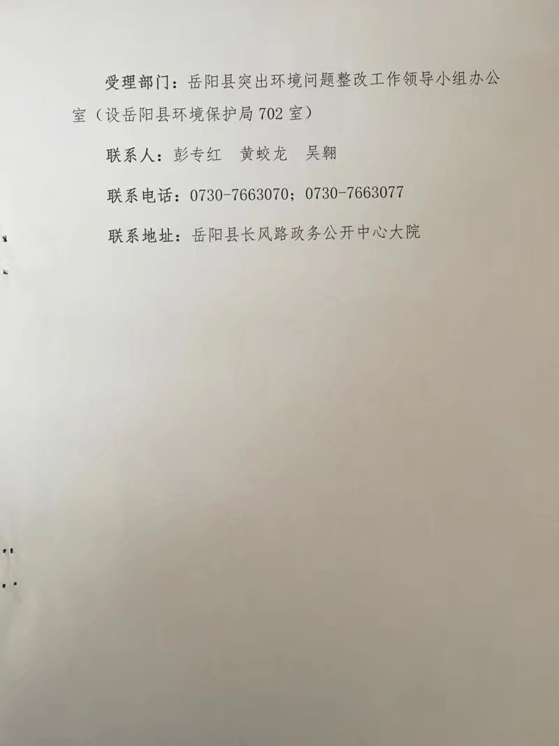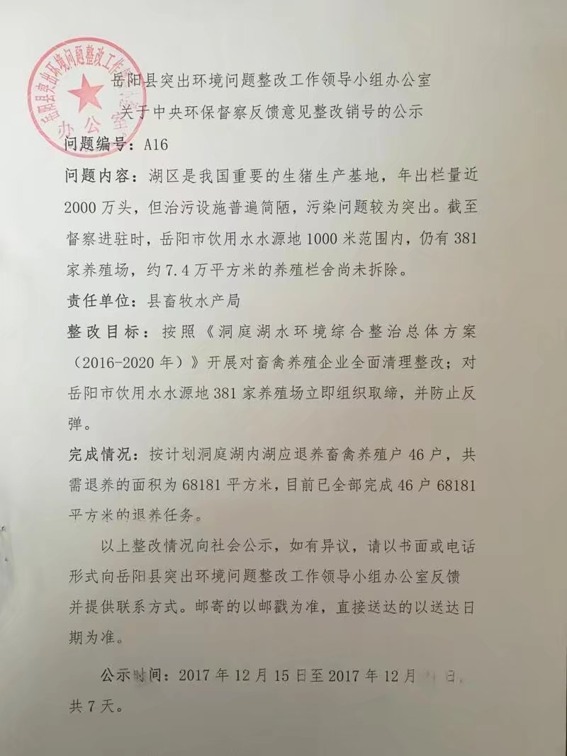 嶽陽縣突出環境問題整改工作領導小組辦公室關於中央環保督察反饋意見整改銷號的公示A16
