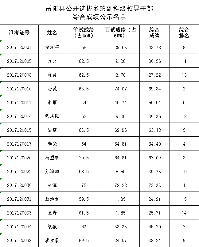 附:嶽陽縣公開選拔鄉鎮副科級領導幹部綜合成績公示名單
