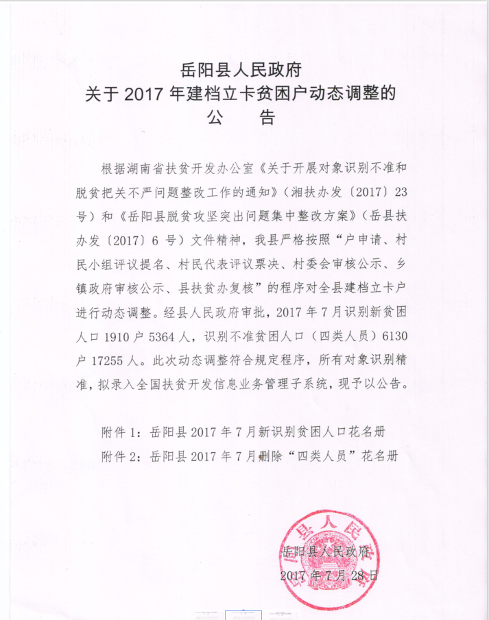 嶽陽縣人民政府關於2017年建檔立卡貧困戶動態調整的公告