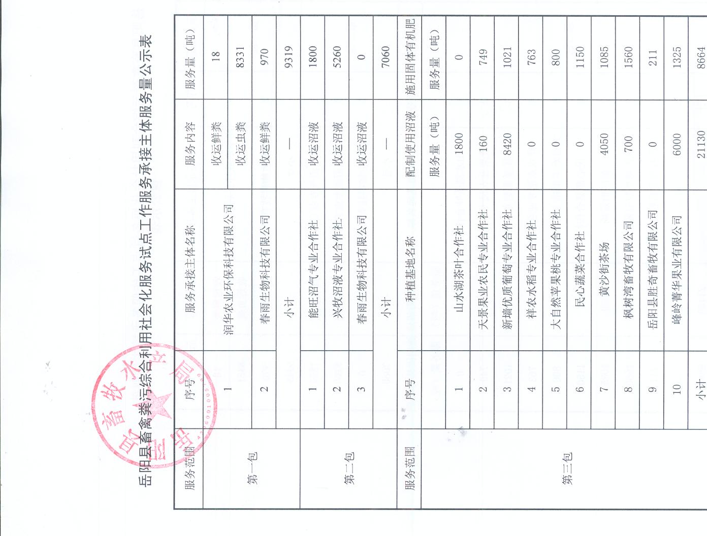 為切實做好我縣畜禽糞汙綜合利用社會化服務,確保試點工作順利實施,根據農辦財[2016]36號和湘牧漁聯[2016]18號等文件精神及試點工作要求,縣財政局、縣畜牧水產局組織對嶽陽縣畜禽糞汙綜合利用社會化服務試點工作的15個服務承接主體自2017年8月至2017年12月的工作開展情況進行了核查,現特將核定的各服務承接主體的服務量予以公示,公示期5個工作日,公示日期為2018年1月15至1月19日,接受社會監督。