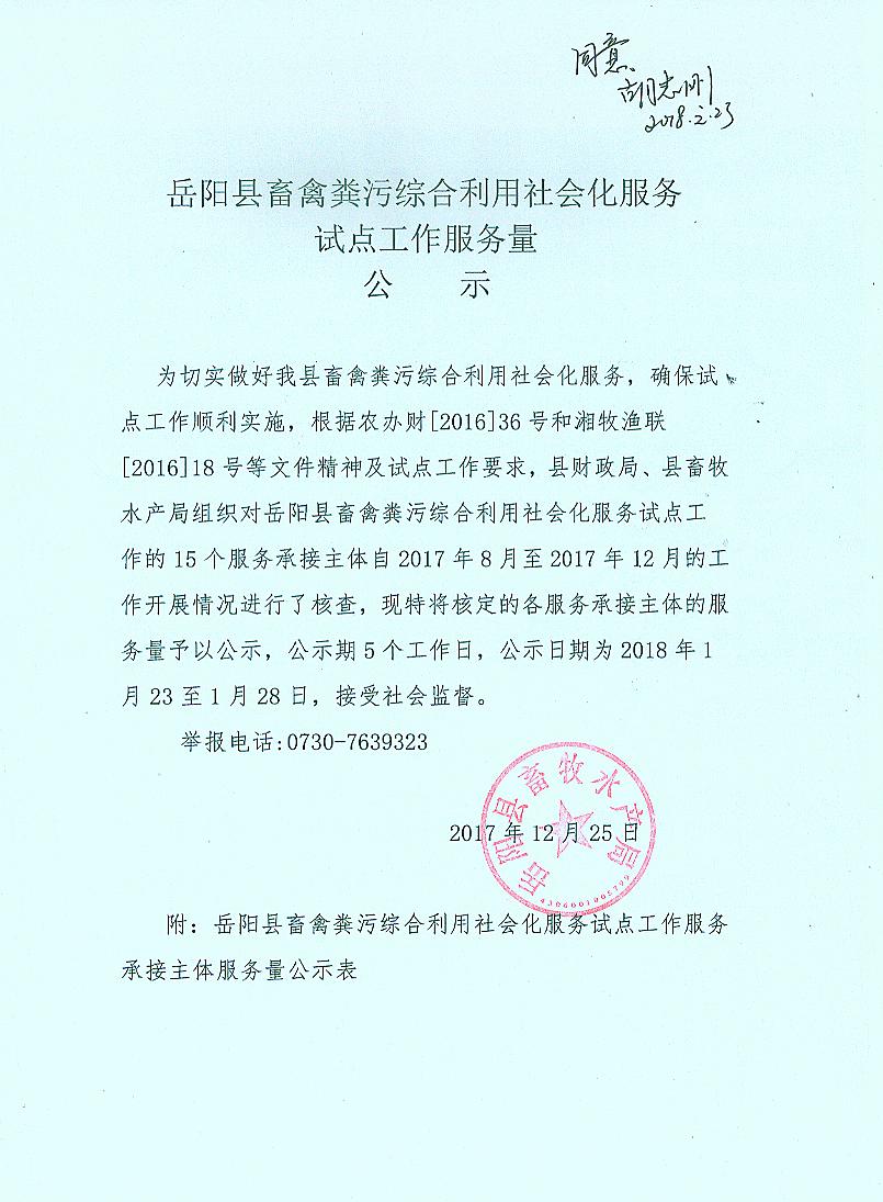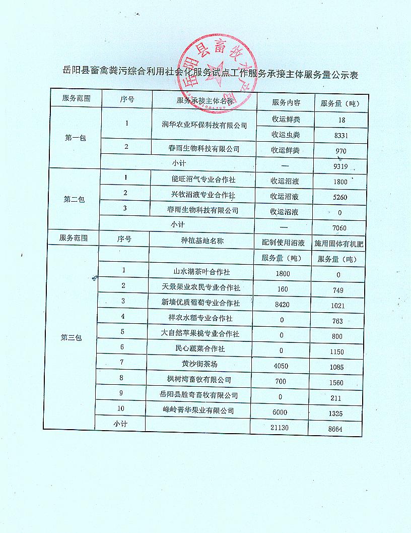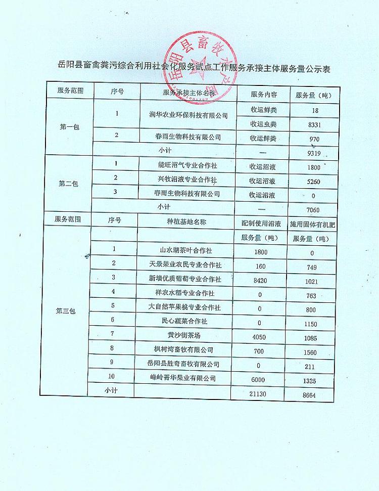 嶽陽縣畜禽糞汙綜合利用社會化服務試點工作服務量公示2