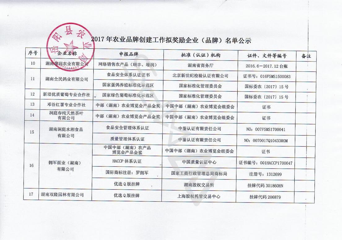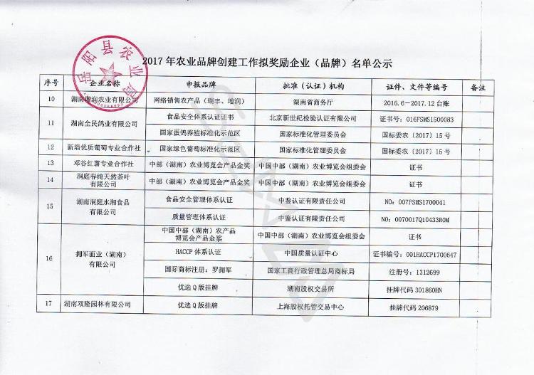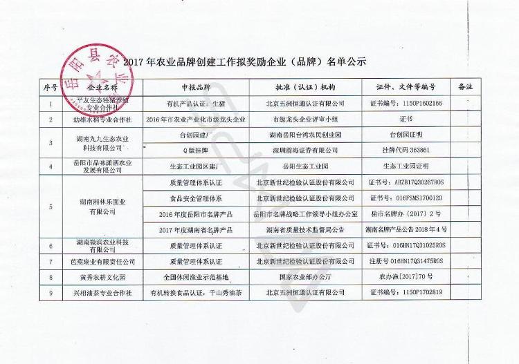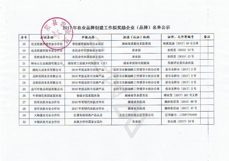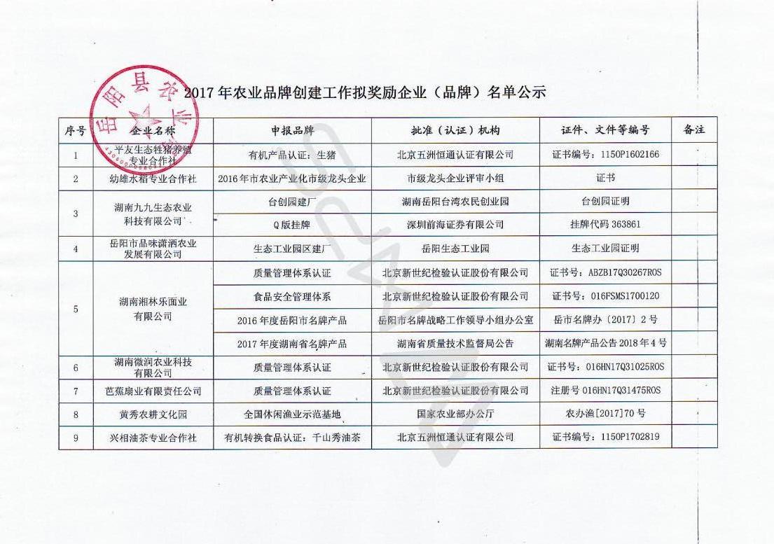 經企業申報、農業企業協會推薦和縣農業品牌創建工作領導小組辦公室審定,擬對下列企業(品牌)給予獎勵。根據《嶽陽縣農業品牌創建獎勵辦法(暫行)》文件規定,現將2017年度農業品牌創建工作擬獎勵企業(品牌)基本情況予以公示,公示截止時間為2018年2月25日,歡迎公眾對相關企業(品牌)申報工作予以監督。