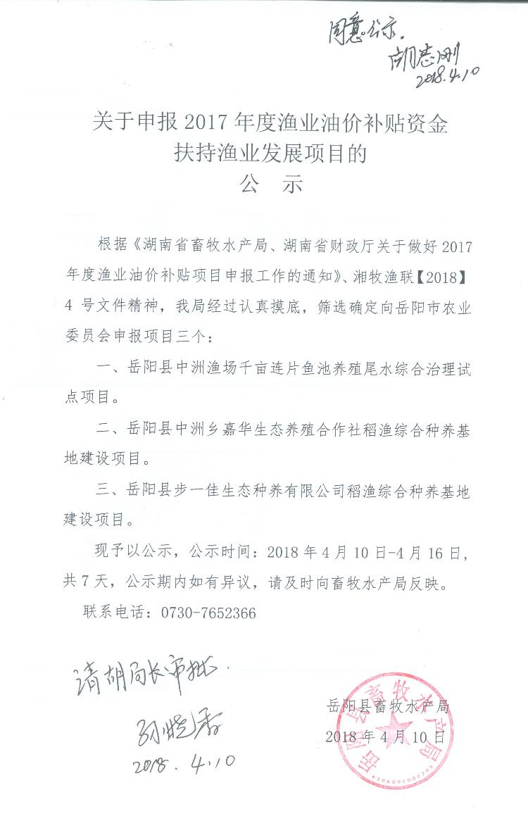 關於申報2017年度漁業油價補貼資金扶持漁業發展項目的公示