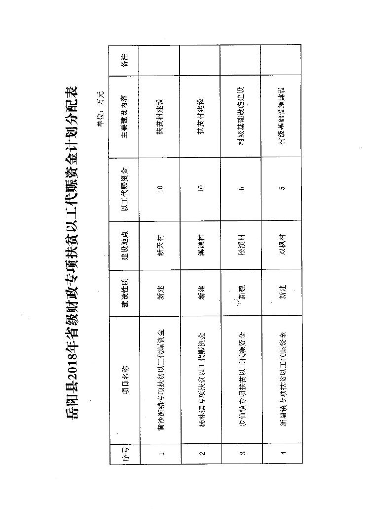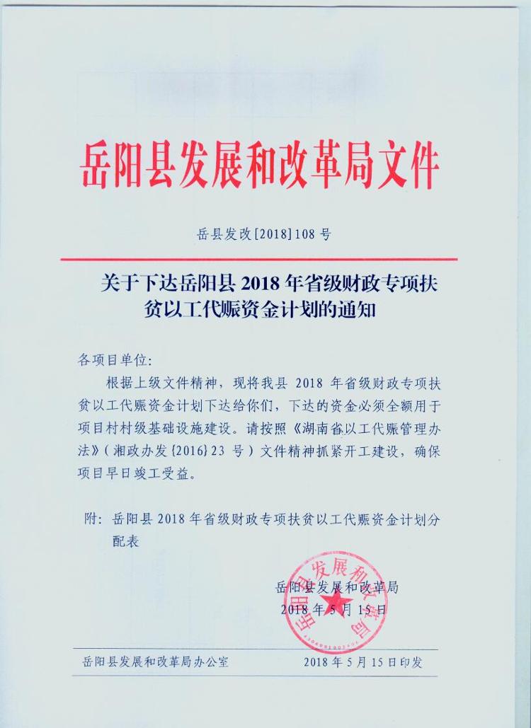 關於下達嶽陽縣2018年省級財政專項扶貧以工代賑資金計劃的通知