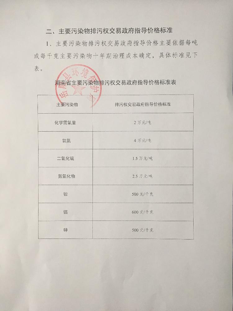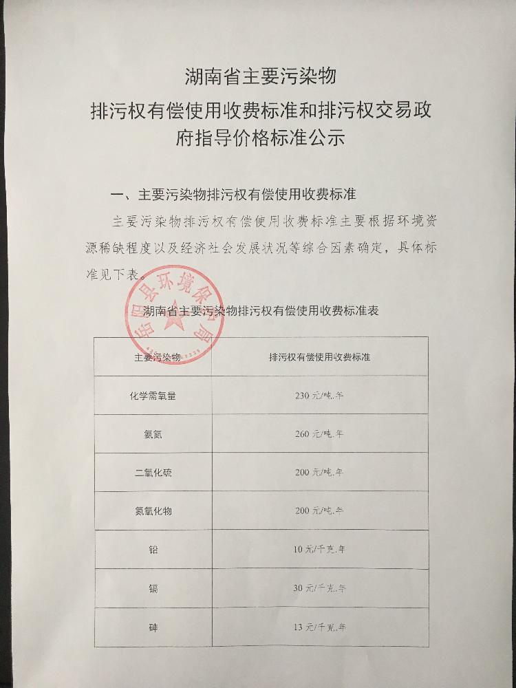 湖南省主要汙染物排汙權有償使用收費標準和排汙權交易政府指導價格標準公示