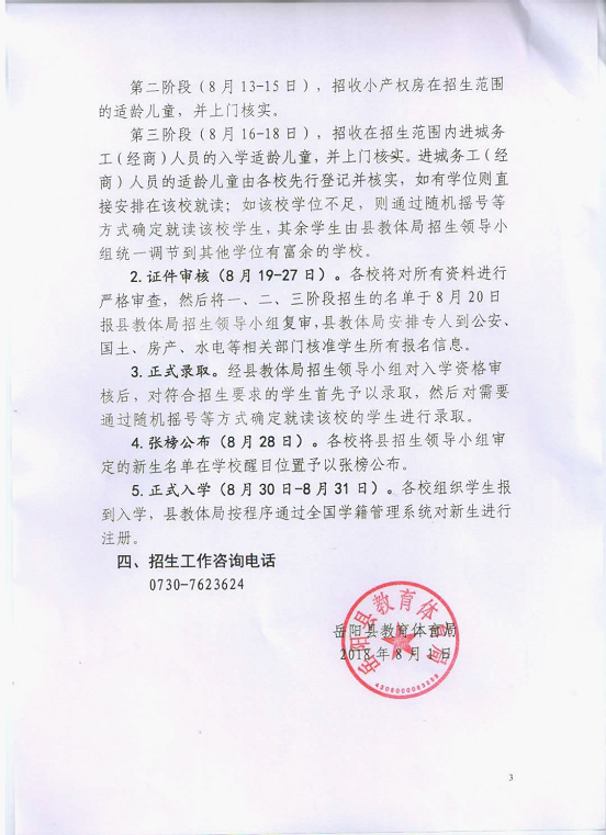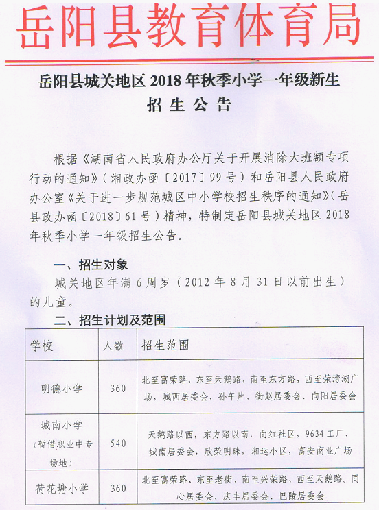 嶽陽縣城關地區2018年秋季小學一年級新生招生公告