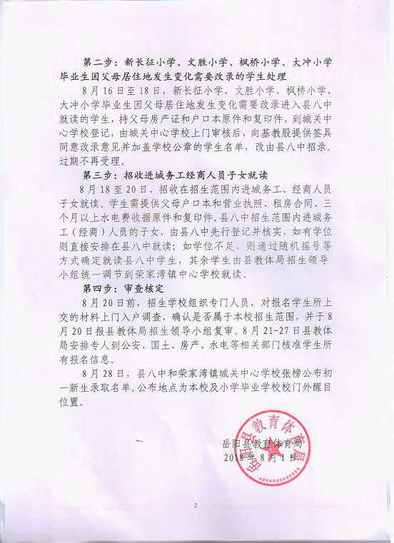 2018年嶽陽縣城關地區初中七年級新生招生公告