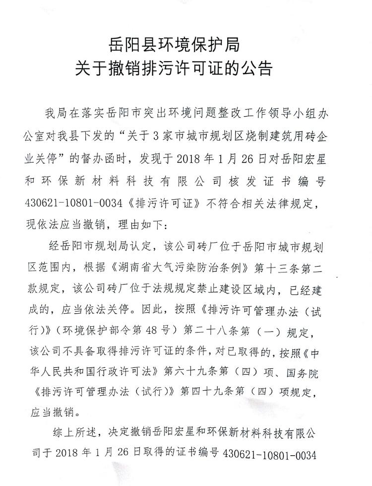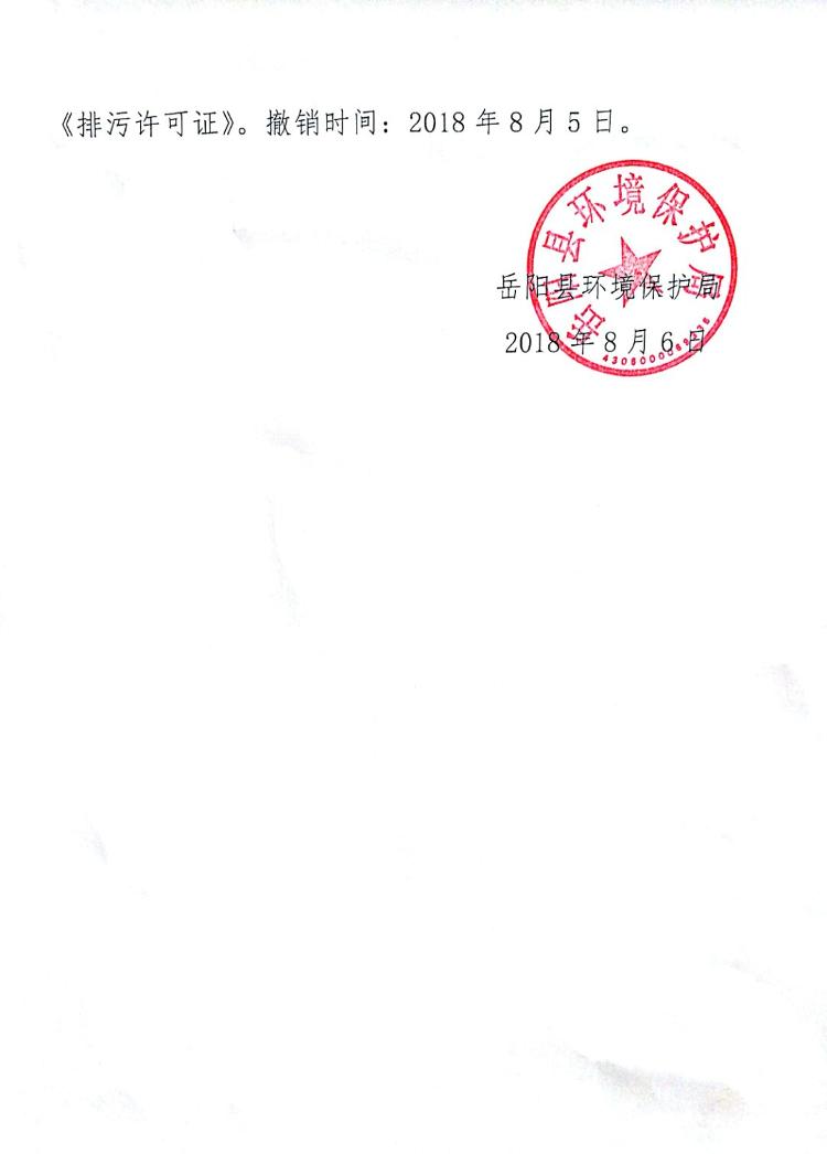 嶽陽縣環境保護局關於撤銷排汙許可證的公告