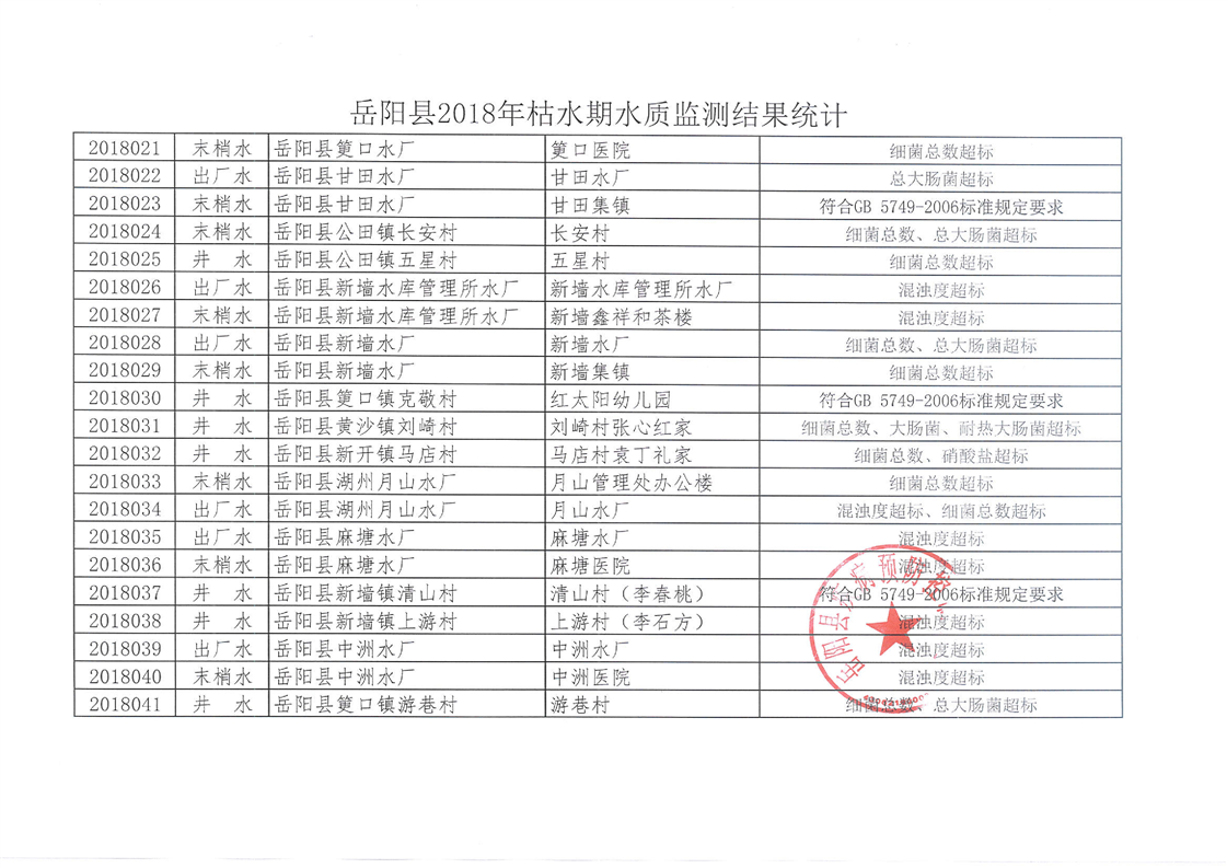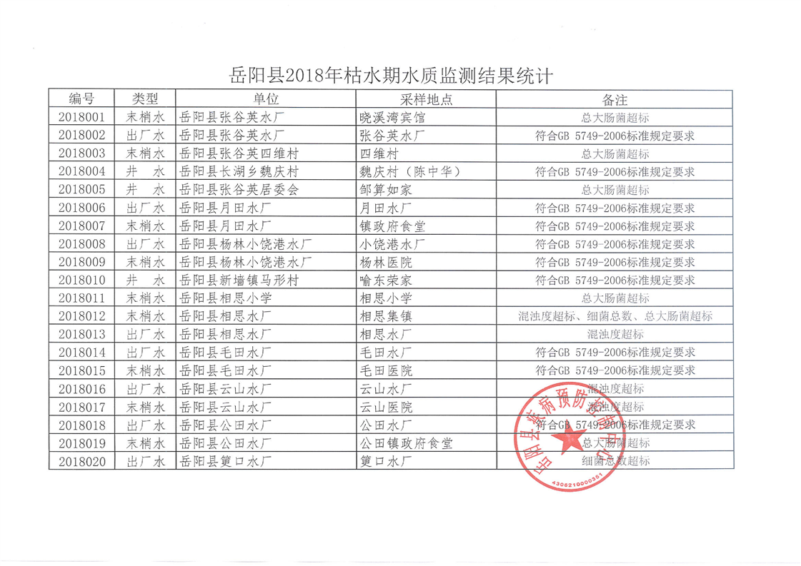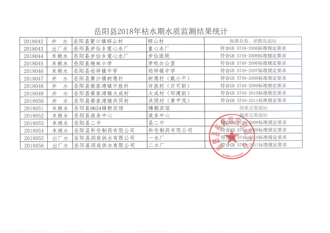 嶽陽縣2018年枯水期水質監測結果統計