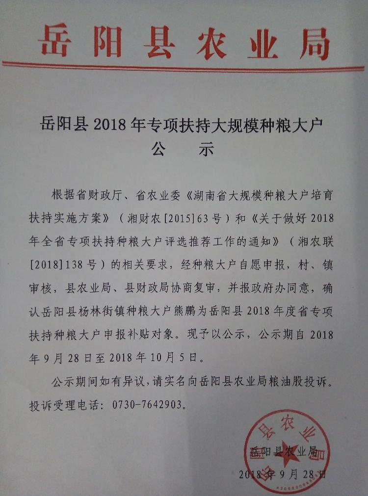 嶽陽縣2018年專項扶持大規模種糧大戶公示
