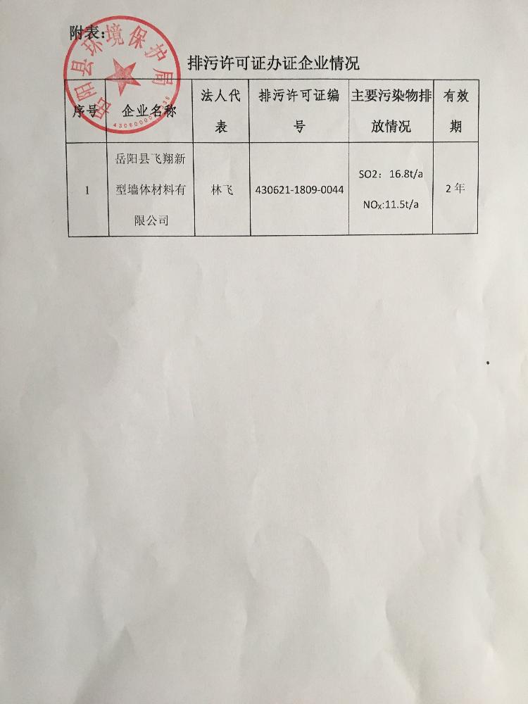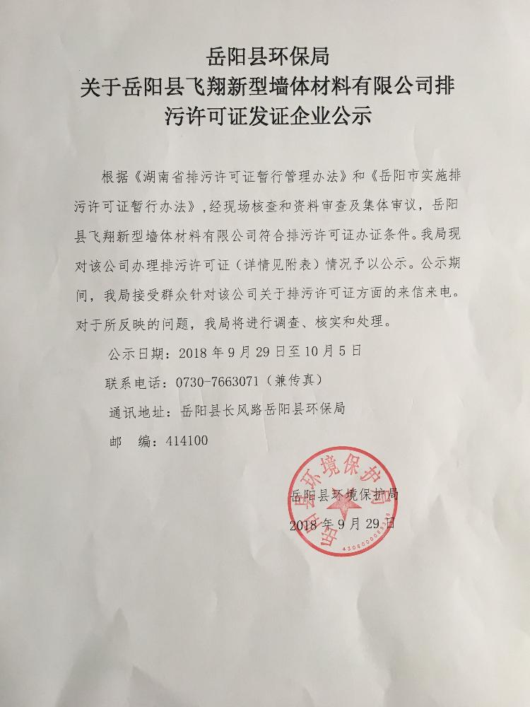嶽陽縣環保局關於嶽陽縣飛翔新型牆體材料有限公司排汙許可證發證企業公示