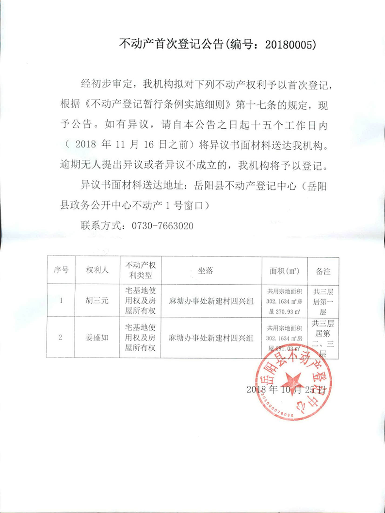 不動產首次登記公告(編號:20180005)