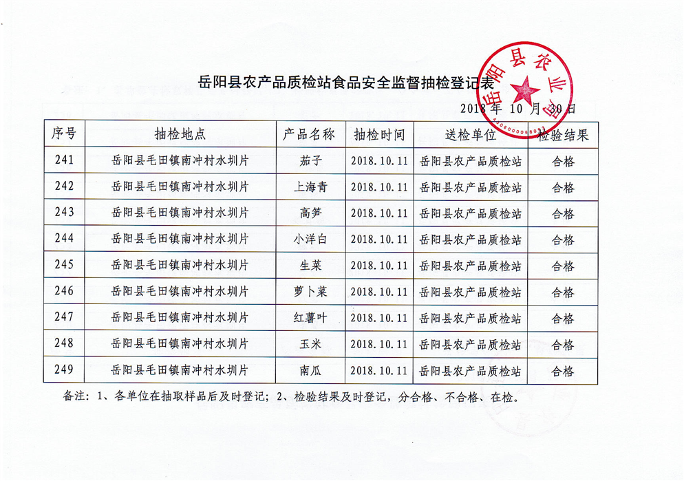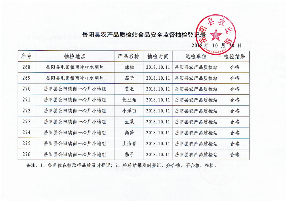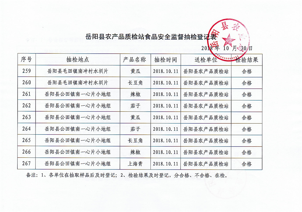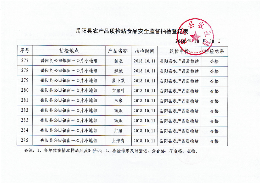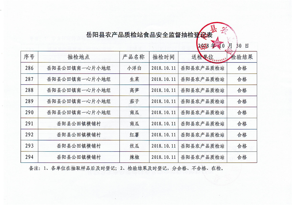嶽陽縣農產品質檢站食品安全監督抽檢登記表4