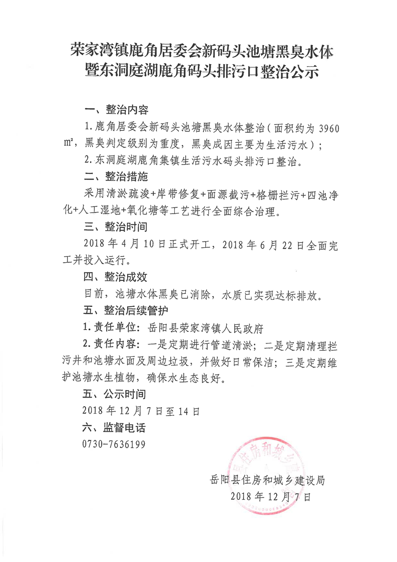 榮家灣鎮鹿角鎮居委會新碼頭池塘黑臭水體暨東洞庭湖鹿角碼頭排汙口整治公示