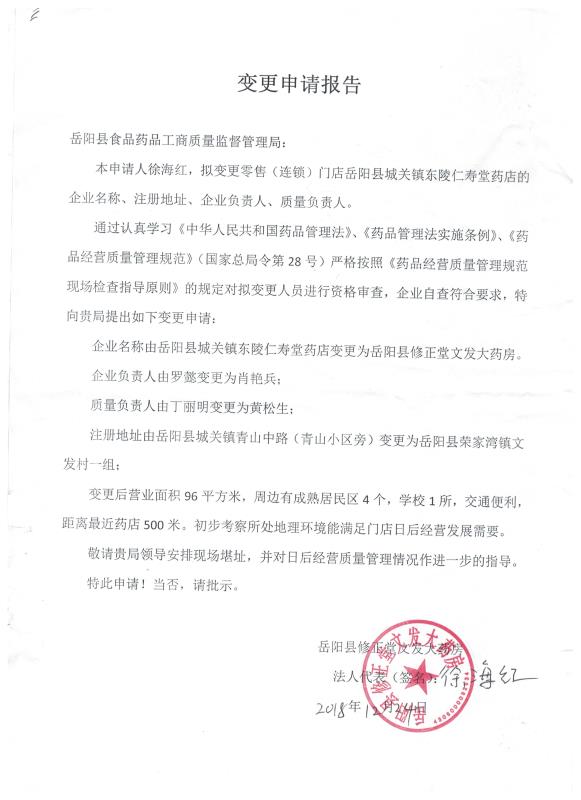 關於嶽陽縣榮家灣鎮東陵仁壽堂藥店的變更申請報告