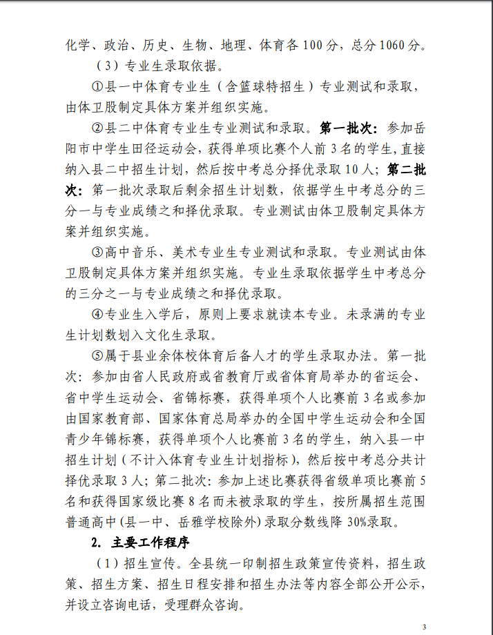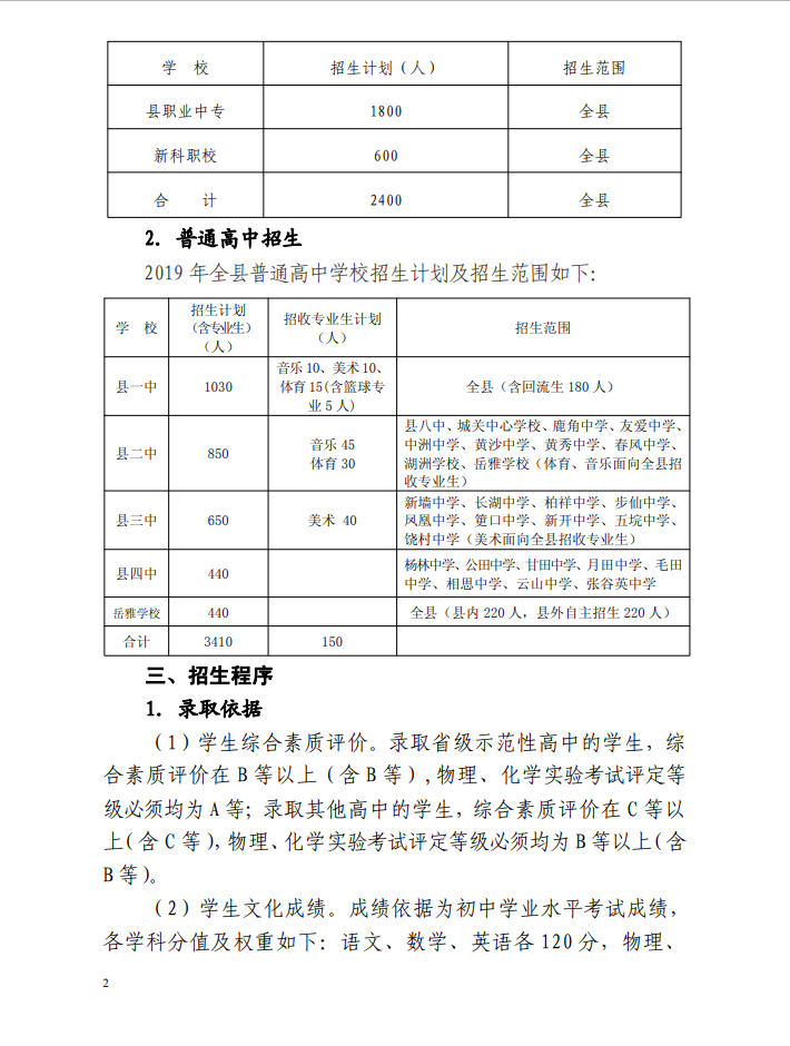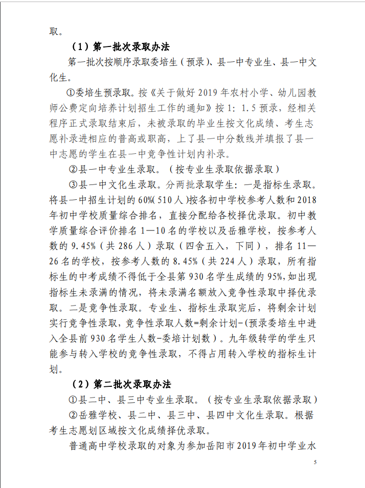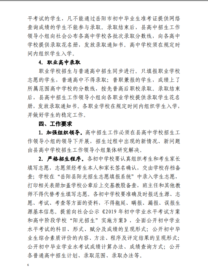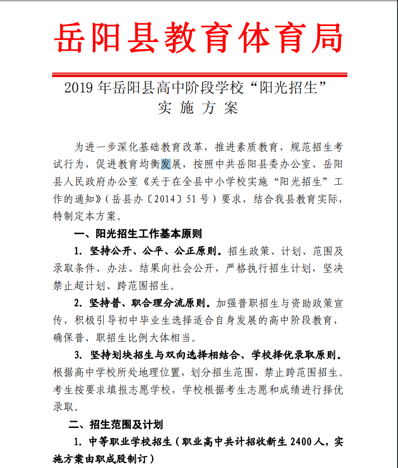 2019 年嶽陽縣高中階段學校“陽光招生” 實施方案”