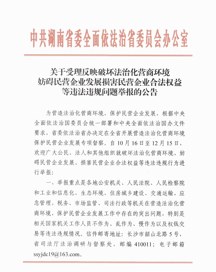關於受理反映破壞法治化營商環境妨礙民營企業發展損害民營企業合法權益等違法違規問題舉報的公告