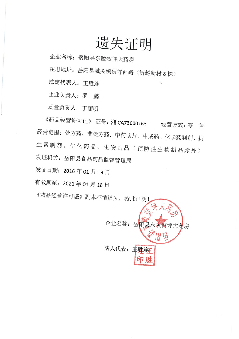 嶽陽縣東陵賀坪大藥房《藥品經營許可證》副本遺失公告