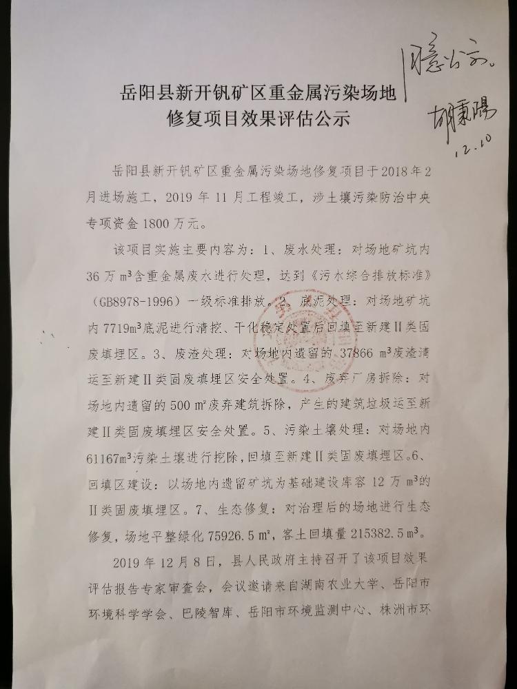 嶽陽縣新開釩礦區重金屬汙染場地修複項目效果評估公示