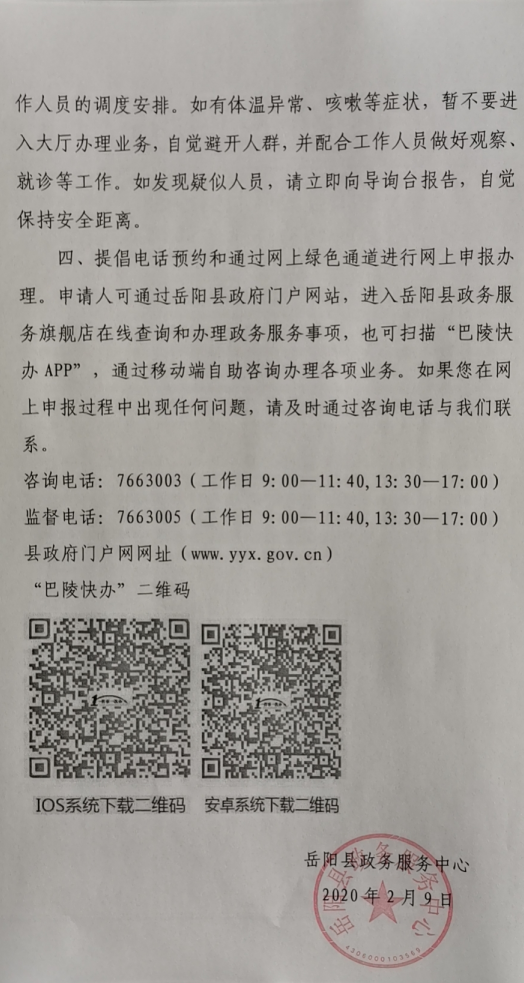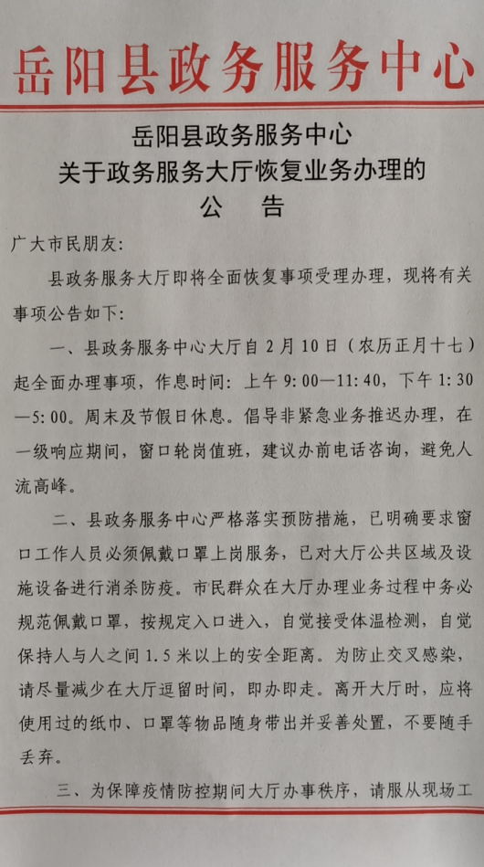 嶽陽縣政務服務中心關於政務服務大廳恢複業務辦理的公告
