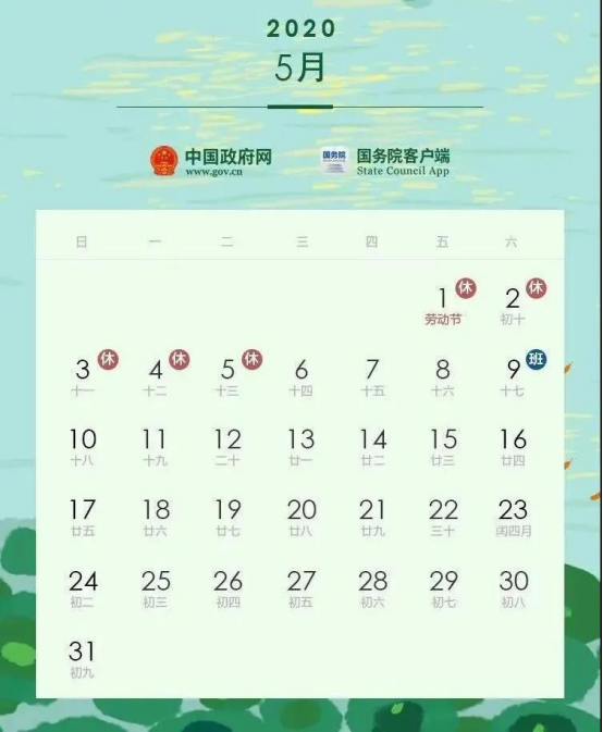 根據國務院辦公廳《關於2020年部分節假日安排的通知》,現將縣政務服務中心政務大廳“五一”期間放假安排通知如下: 5月1日(星期五)至5月5日(星期二)放假,共5天;4月26日(星期日),5月9日(星期六)上班。請廣大人民群眾合理安排辦事時間,放假期間政務大廳各窗口不對外辦公。
