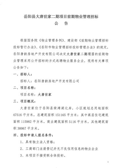關於公開嶽陽縣大唐世家二期項目前期物業管理招標投標的公示