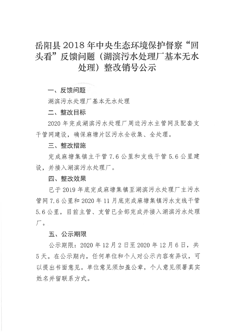 嶽陽縣2018年中央生態環境環保督察“回頭看”反饋問題(湖濱汙水處理廠基本無水處理)整改銷號公示