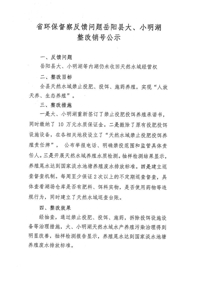 省環保督察反饋問題嶽陽縣大、小明湖整改銷號公示