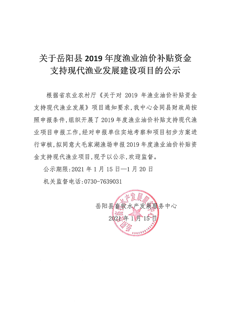 關於嶽陽縣2019年度漁業油價補貼資金支持現代漁業發展建設項目的公示