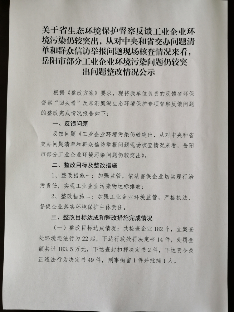 關於省生態環境保護督察反饋工業企業環境汙染仍較突出,從對中央和省交辦問題清單和群眾信訪舉報問題現場核查情況來看,嶽陽市部分工業企業環境汙染問題仍較突出問題整改情況公示