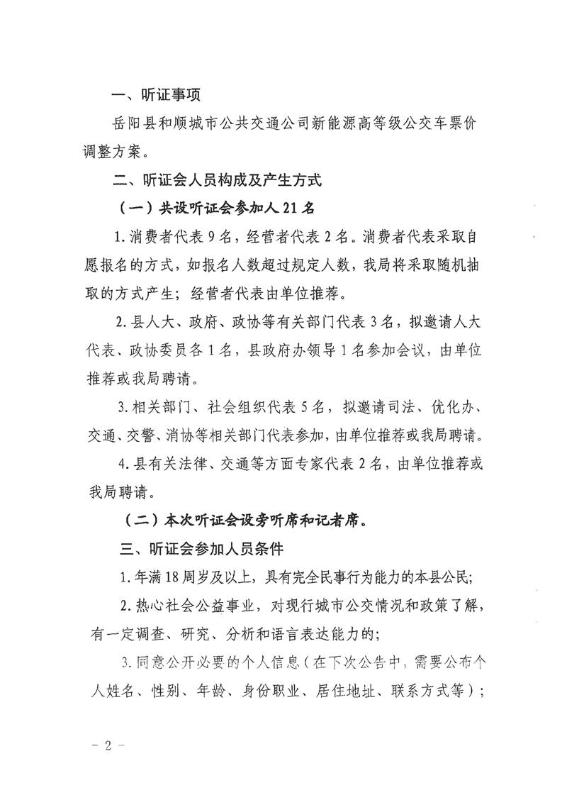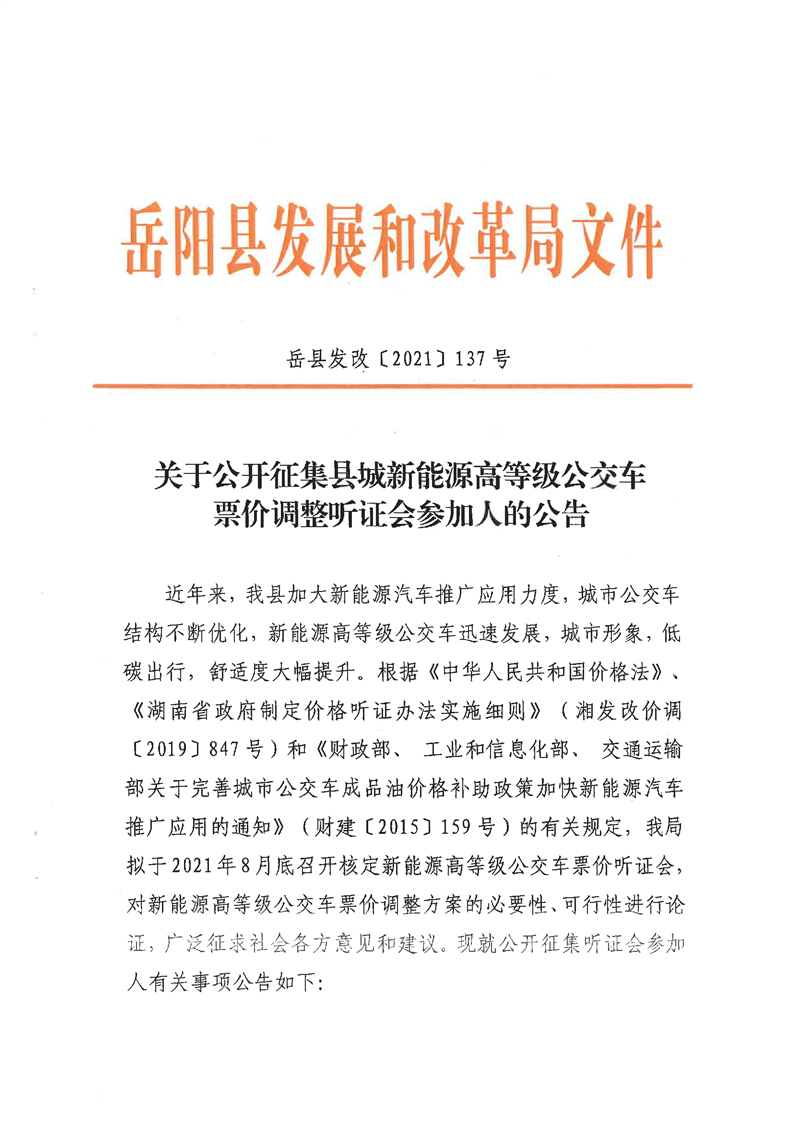 關於公開征集縣城新能源高等級公交車票價調整聽證會參加人的公告