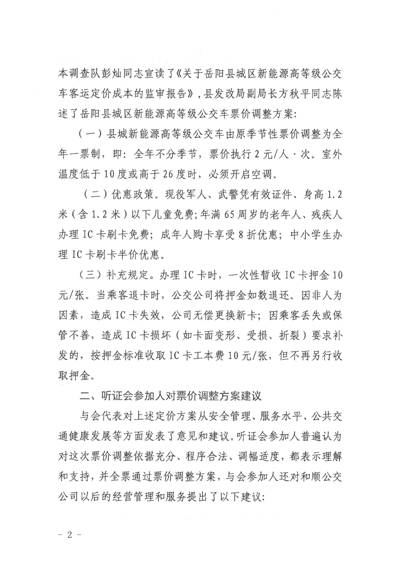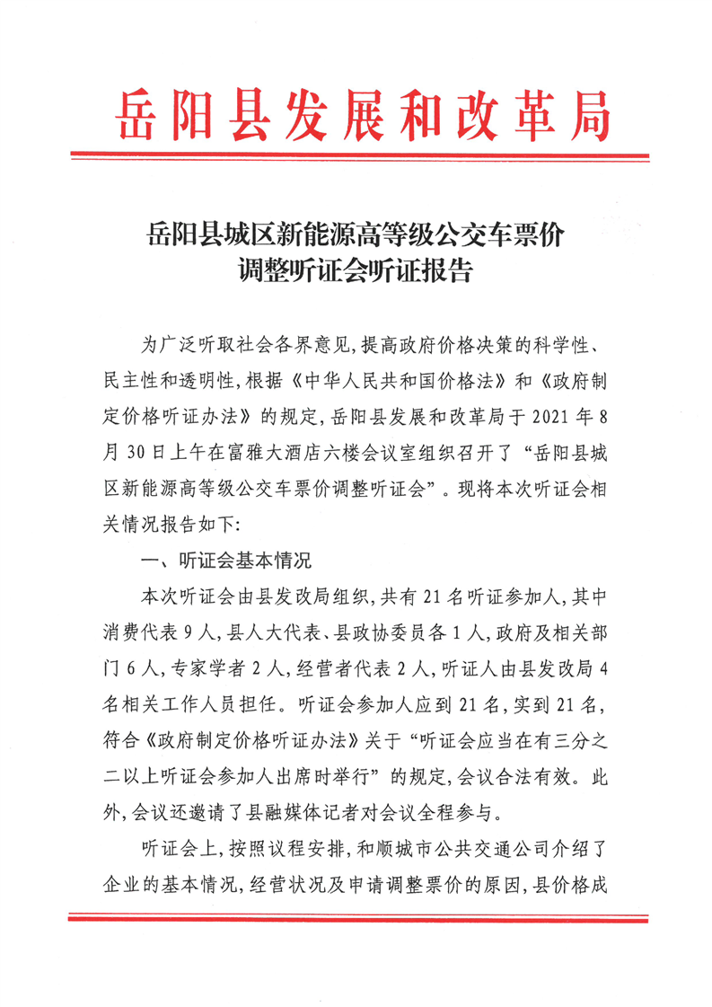 嶽陽縣城區新能源高等級公交車票價調整聽證會聽證報告